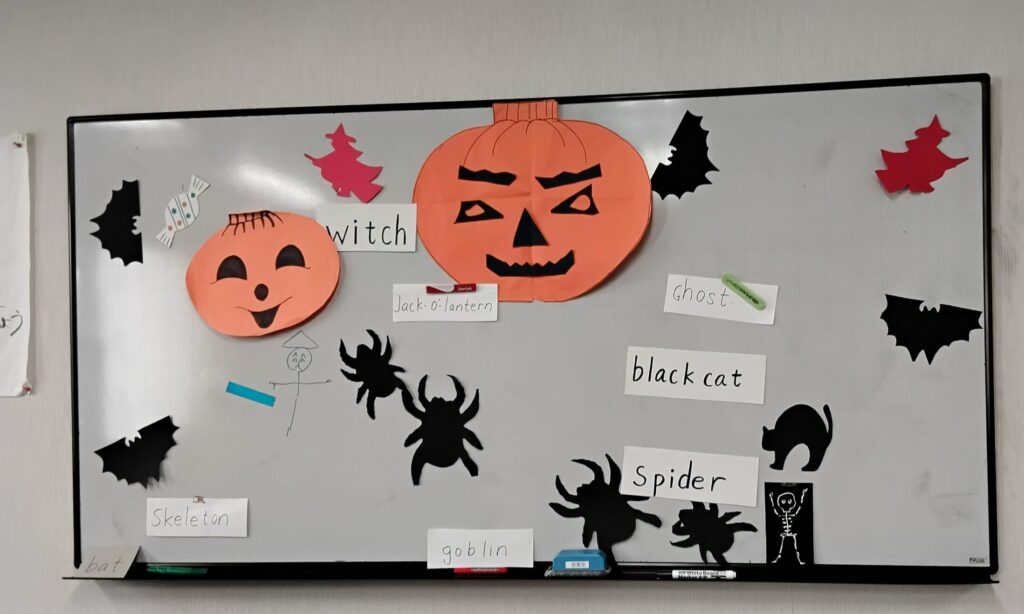 デイケアの英会話プログラムでは、ハロウィンの日にちなんで、講師の先生お手製の可愛いハロウィンのイラストでホワイトボードの飾りつけを行ったり、ゲームを楽しみました!